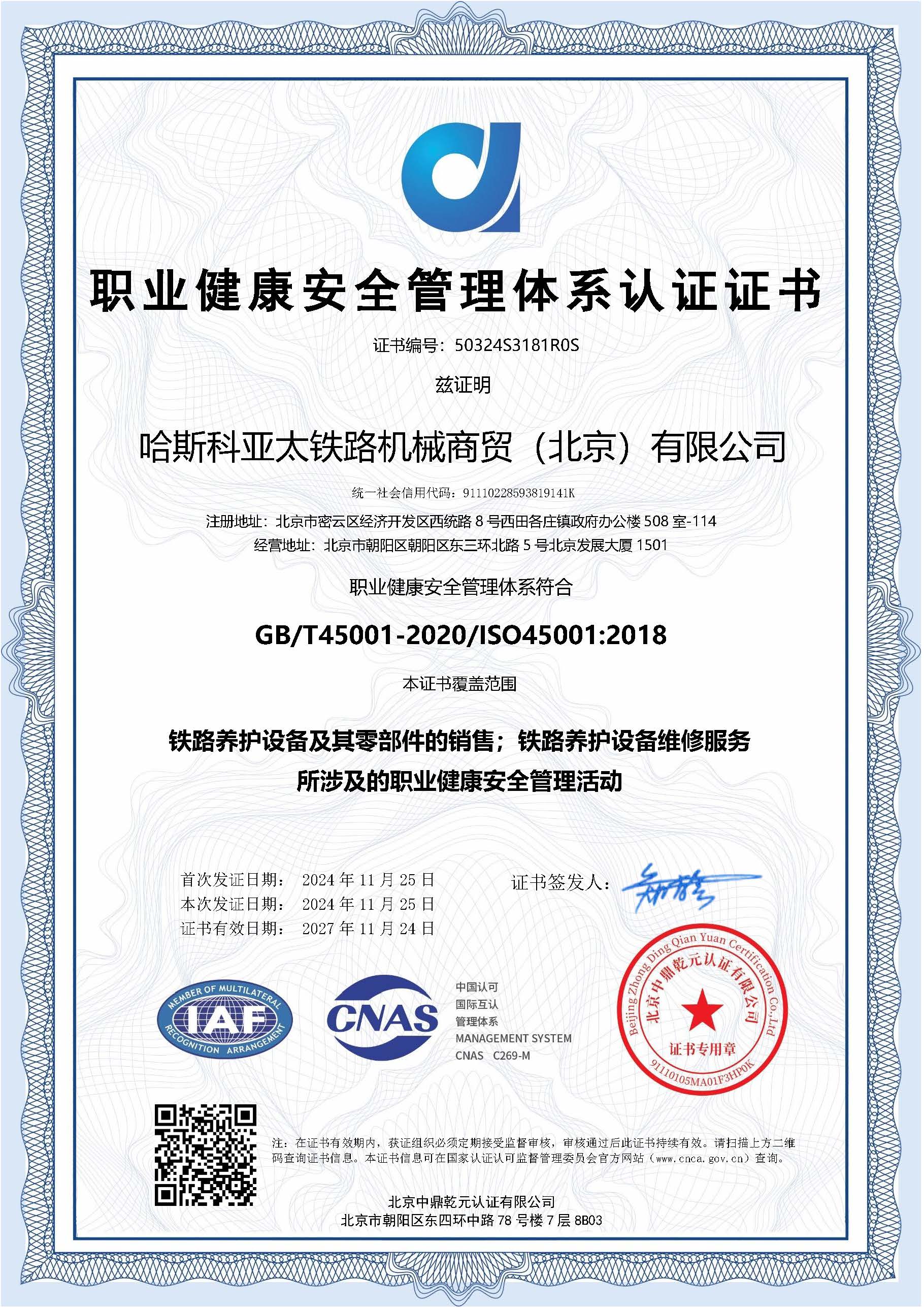 ISO 45001:2018 職業(yè)健康安全管理體系認(rèn)證證書(shū)