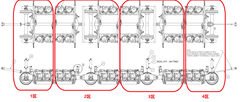 2、作業(yè)小車兩頭的8臺(tái)電機(jī)(圖二中的1區(qū)和4區(qū))角度盡量避開鋼軌頂面區(qū)域,比如-5°~15°之間(這個(gè)角度區(qū)域根據(jù)實(shí)際情況調(diào)整)。如果確實(shí)無法避開這些角度,則可以考慮降低功率,具體的安全功率范圍應(yīng)在現(xiàn)場(chǎng)做測(cè)試后確定。