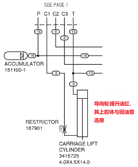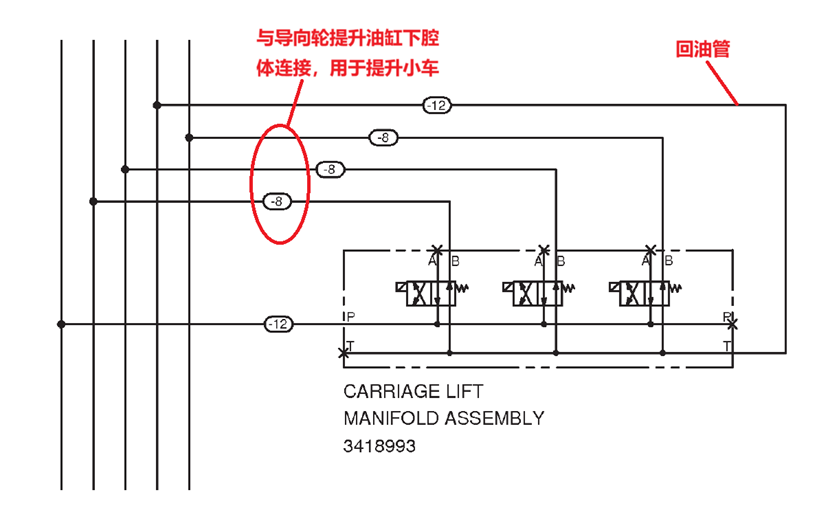 作業(yè)小車提升油缸控制閥是常見的兩位四通換向閥,其線圈在未得電時(shí),油缸的下腔體通過該閥與回油管連接,而上腔體是直接與回油管連接的,如圖六和圖七所示。因此,當(dāng)作業(yè)小車導(dǎo)向輪落到鋼軌上后,控制閥失電的情況下,提升油缸的上下腔體都與回油管連接,使作業(yè)小車處于自由懸浮狀態(tài)。