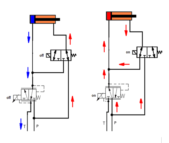 打磨電機(jī)的上下動(dòng)作動(dòng)力來源是進(jìn)給油缸,當(dāng)作業(yè)開始后,激活閥和比例閥得電,其閥芯動(dòng)作后,將進(jìn)給油缸的上腔體油路與液壓泵引來的壓力管連通,此時(shí)進(jìn)給油缸的上下腔體同時(shí)受液壓泵壓力的作用,如圖八所示,左側(cè)油路是磨頭未激活的狀態(tài),右側(cè)油路是磨頭激活下壓打磨時(shí)的狀態(tài)。