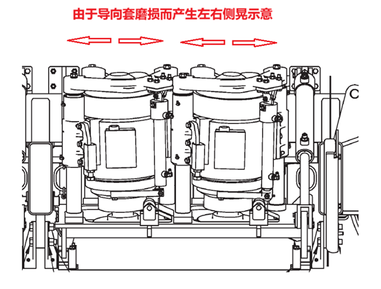 在上述基礎(chǔ)上,還可以引申出另一種較為隱蔽但可能影響打磨質(zhì)量的問題,即導(dǎo)向套的磨損對(duì)打磨質(zhì)量產(chǎn)生影響。常規(guī)導(dǎo)向套的內(nèi)襯材質(zhì)是銅,導(dǎo)向桿是鋼材,這兩者在上下動(dòng)作過程中必然存在磨擦,由于材質(zhì)的原因,銅受摩擦后的消耗遠(yuǎn)大于鋼材。在一些使用多年的老車上可以觀察到,許多電機(jī)在下壓到最下端以及從最下端開始上升的一瞬間,電機(jī)整體會(huì)產(chǎn)生左右方向上的側(cè)晃抖動(dòng),如圖九所示: